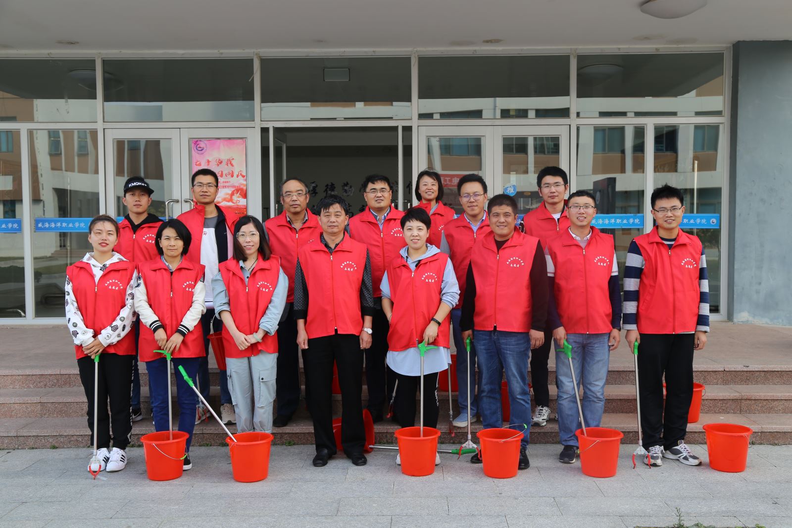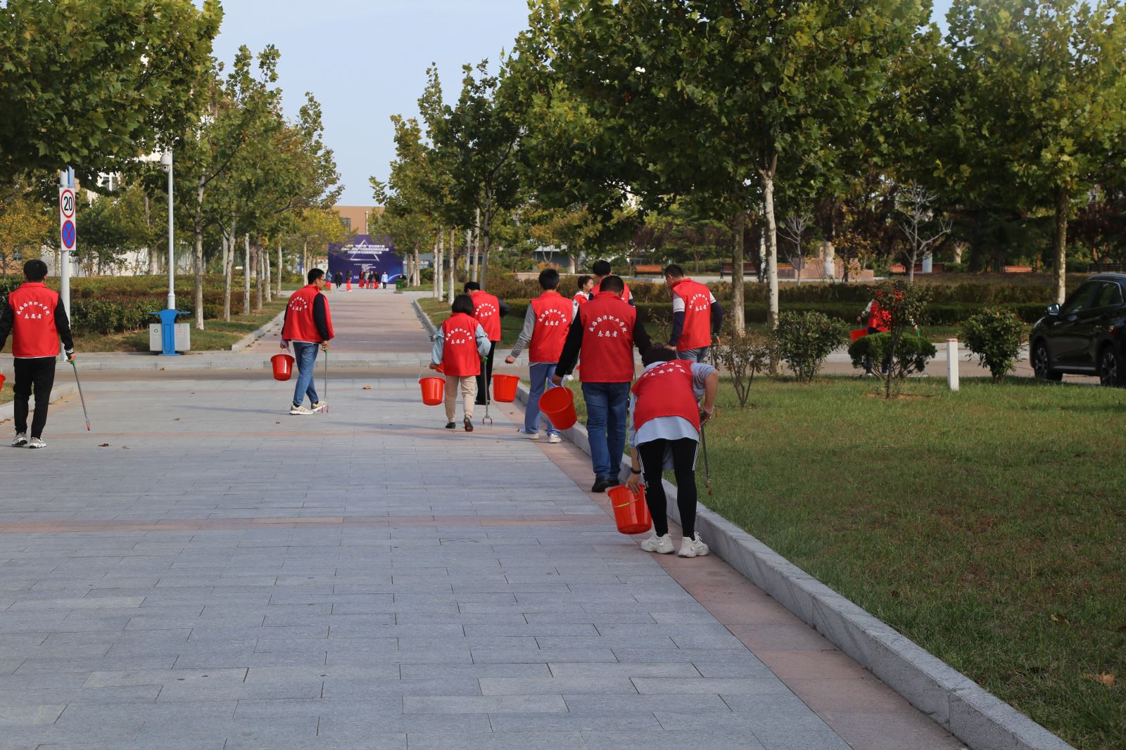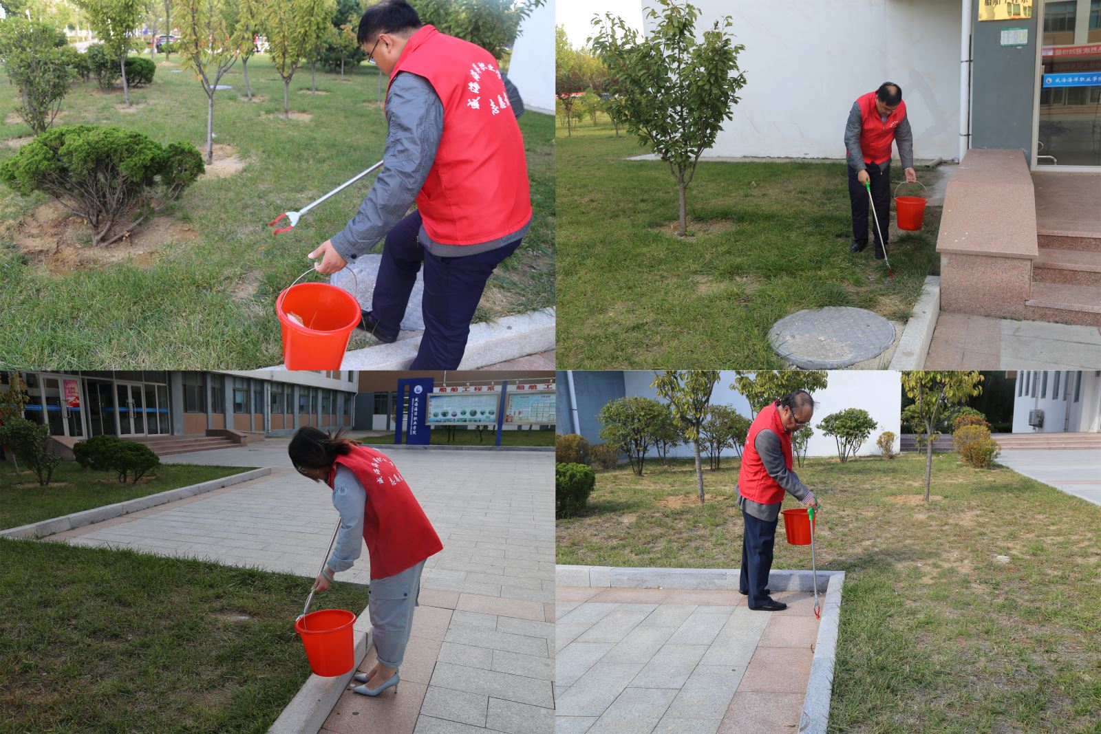 在教学楼区域,党员们开展了沿途垃圾清捡活动,一部分党员提着塑料桶,剩下的党员拿着火钳,大家分工合作一路捡拾,将教学楼区域内遗留的烟头、废纸、桔子皮以及糖果包装等垃圾进行了清理,身体力行向同学们宣传环保知识,弘扬时代新风,营造出浓厚的志愿服务氛围。