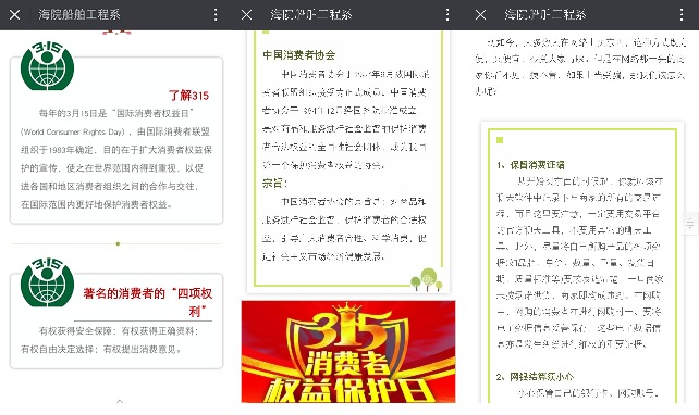 首先,用我系的官方公众号推送关于消费者权益的文章,在其中向大家介绍了,在网络购物盛行的时代,同学们该怎样预防网购诈骗,还有当自己已经受骗后,该如何去解决的途径。然后,在各班召开班会。在班会中,各班班长首先讲述了有关消费方面的新闻和实事,以实例向大家详细讲解了消费者维权时应注意的相关知识和相应的法律法规。接着,同学们也发表了各自的见解,讲述了发生在自己身边的消费问题和一些操作不当的维权行为酿成的不良后果,警醒大家要多关注、多了解相关维权知识。最后,向大家发出倡议,鼓励大家用合法正规的途径去维护自己的权益。