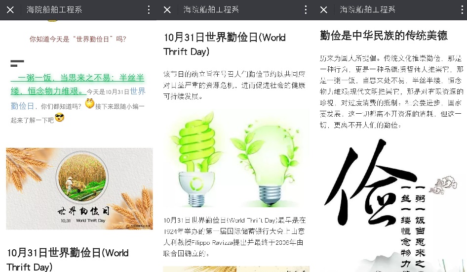 活动开始初期,我系利用QQ,微信等网络途径向大家推送关于“世界勤俭日”的相关知识;还专程制作了海报在系内张贴,增强学生老师们勤俭节约的意识。