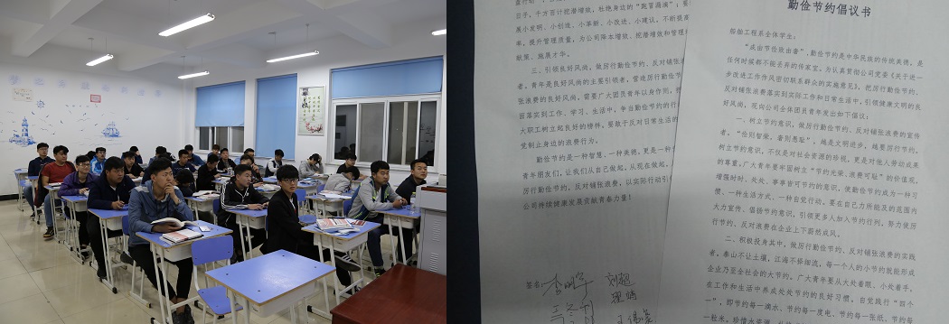 随后,由各班班长主持开展主题班会。班长通过观看PPT的形式,为同学们介绍了那些做到勤俭节约从我做起的榜样,还有那些铺张浪费的反面例子。最后由各班班长宣读并签署了一份“勤俭节约”的倡议书,并向各班同学提出了倡议:创新价值 废物利用 资源回收 循环利用 。