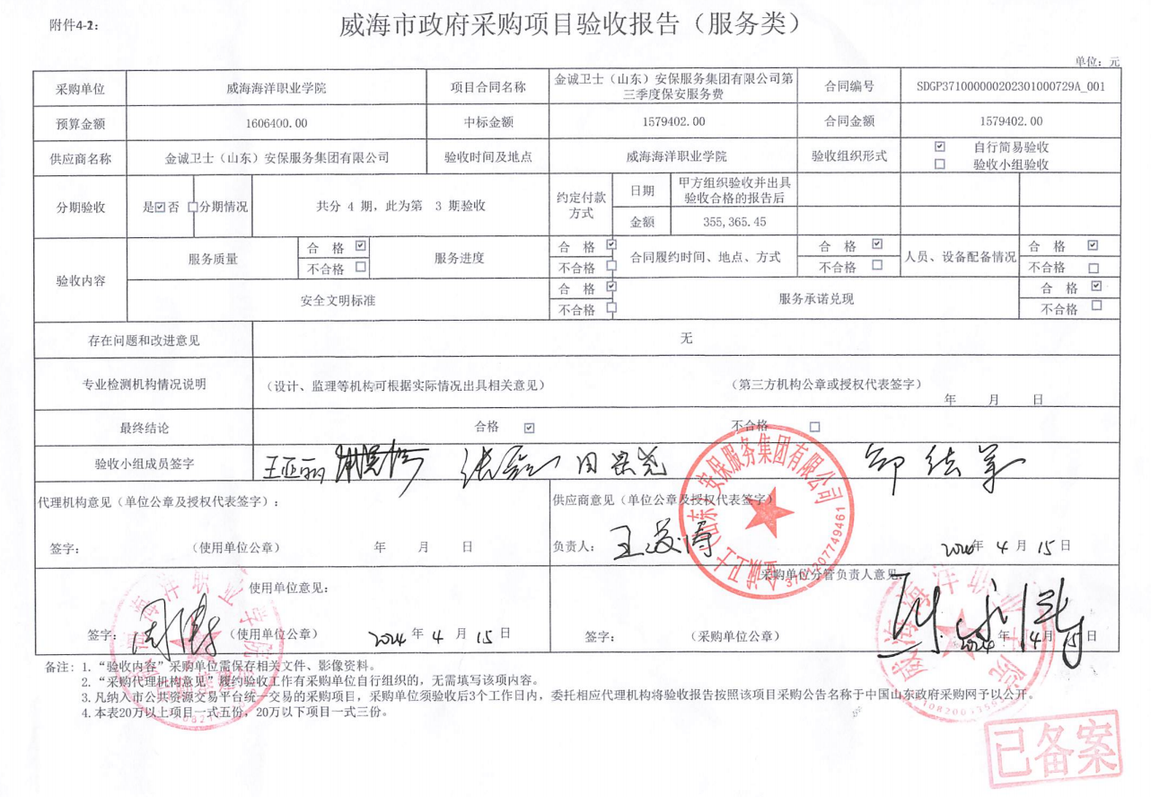 关于威海海洋职业学院物业服务项目(包A)第3期验收公示