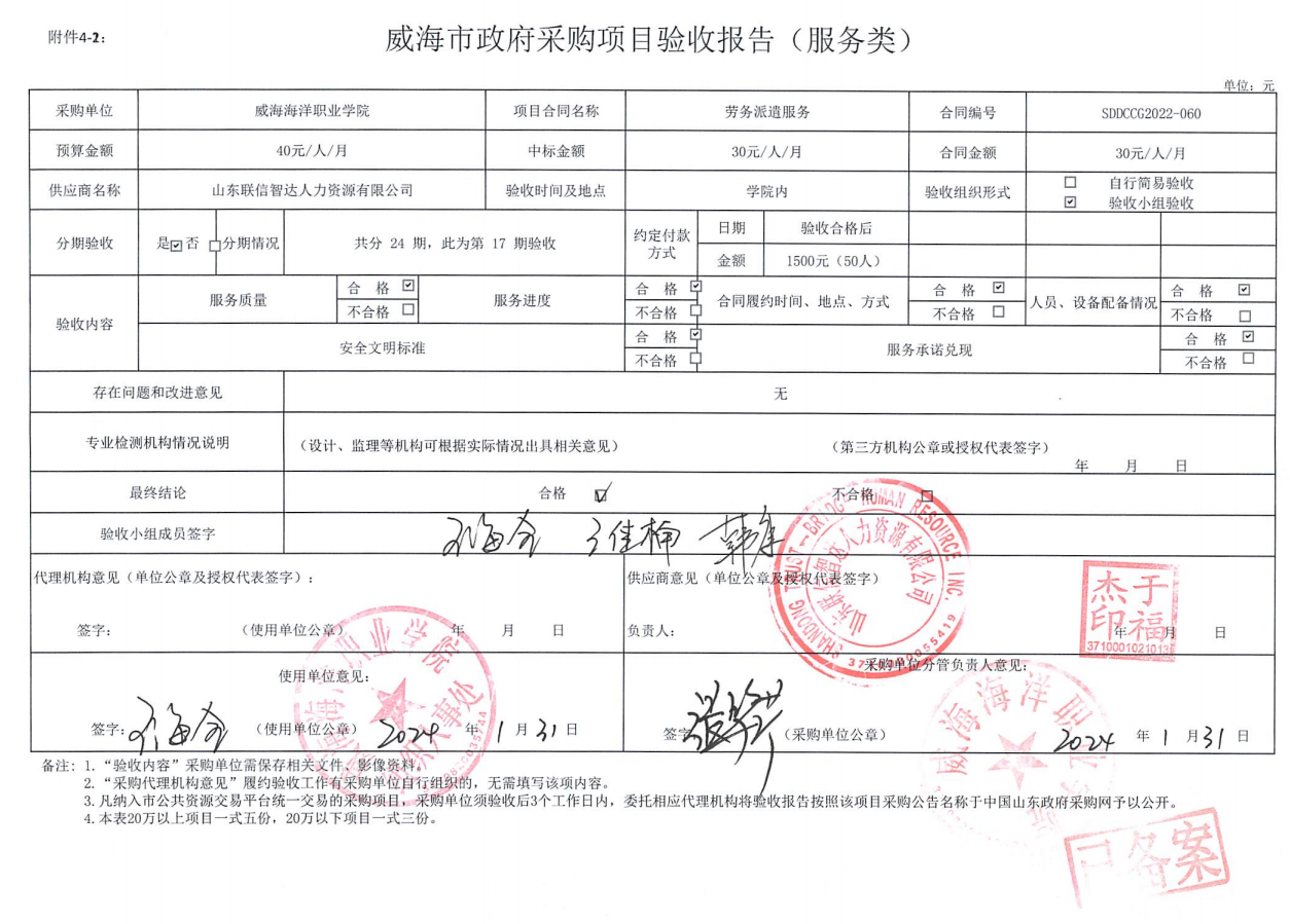 关于威海海洋职业学院劳务派遣服务项目第17期验收公示