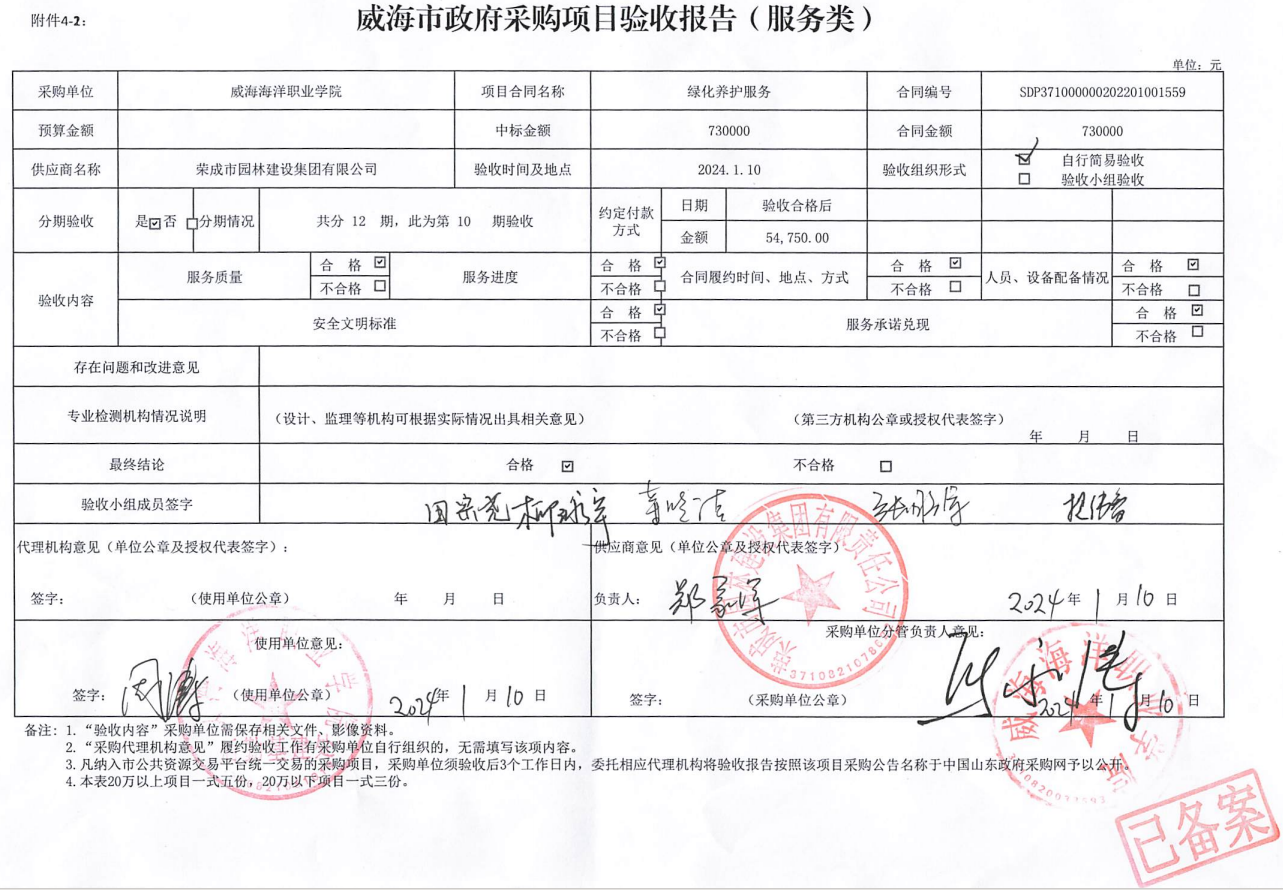 关于威海海洋职业学院2023年度绿化养护服务项目第10期验收公示