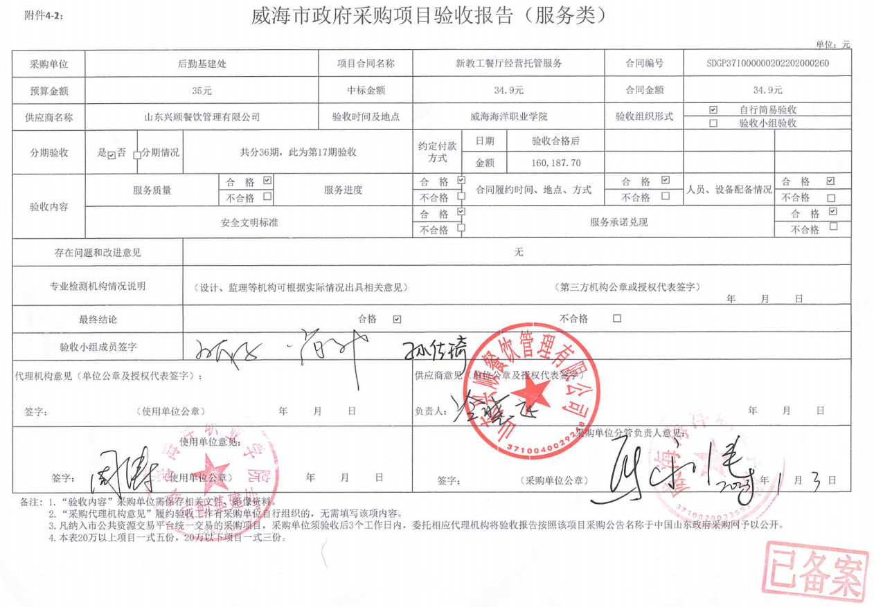 关于威海海洋职业学院新教工餐厅经营托管服务项目第17期验收公示