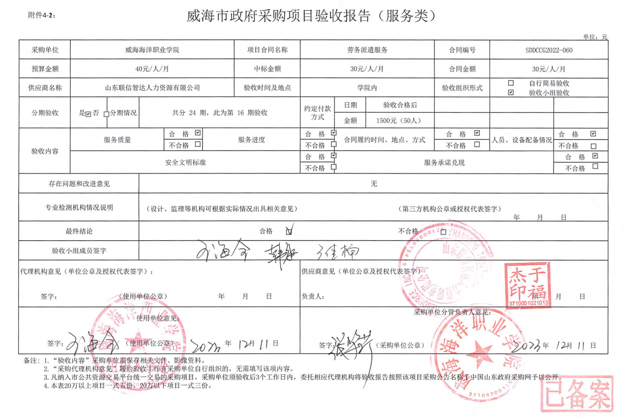 关于威海海洋职业学院劳务派遣服务项目第16期验收公示