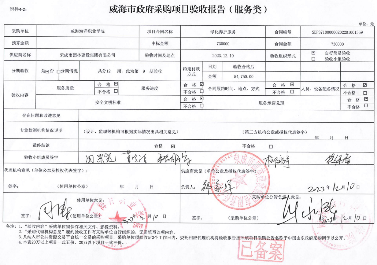 关于威海海洋职业学院2023年度绿化养护服务项目第9期验收公示