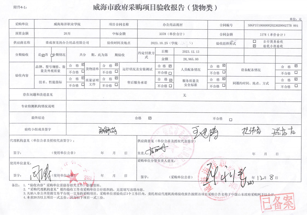 三、供应商名称:荣成市龙涛办公用品有限公司