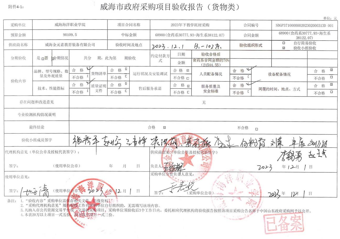 一、合同名称:2023年下教学耗材采购项目——食品水产工具类教学实训耗材