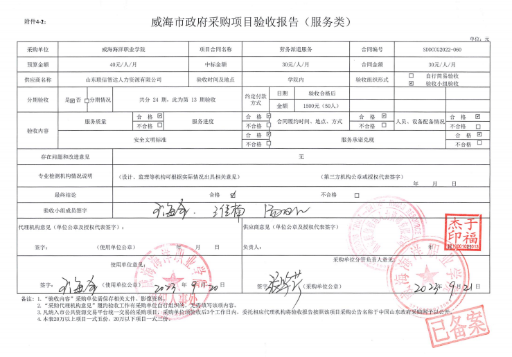 关于威海海洋职业学院劳务派遣服务项目第13期验收公示