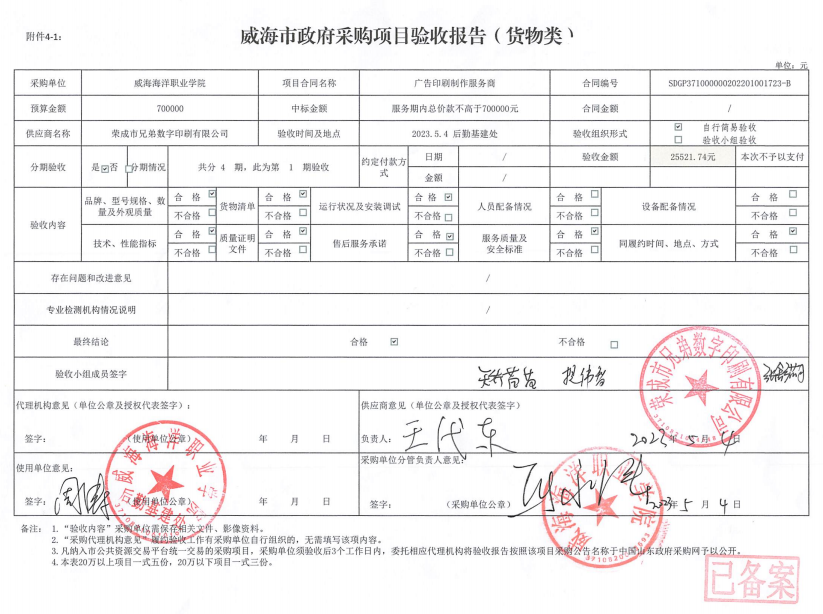 关于威海海洋职业学院广告印刷制作服务商项目(包B)第1期验收公示