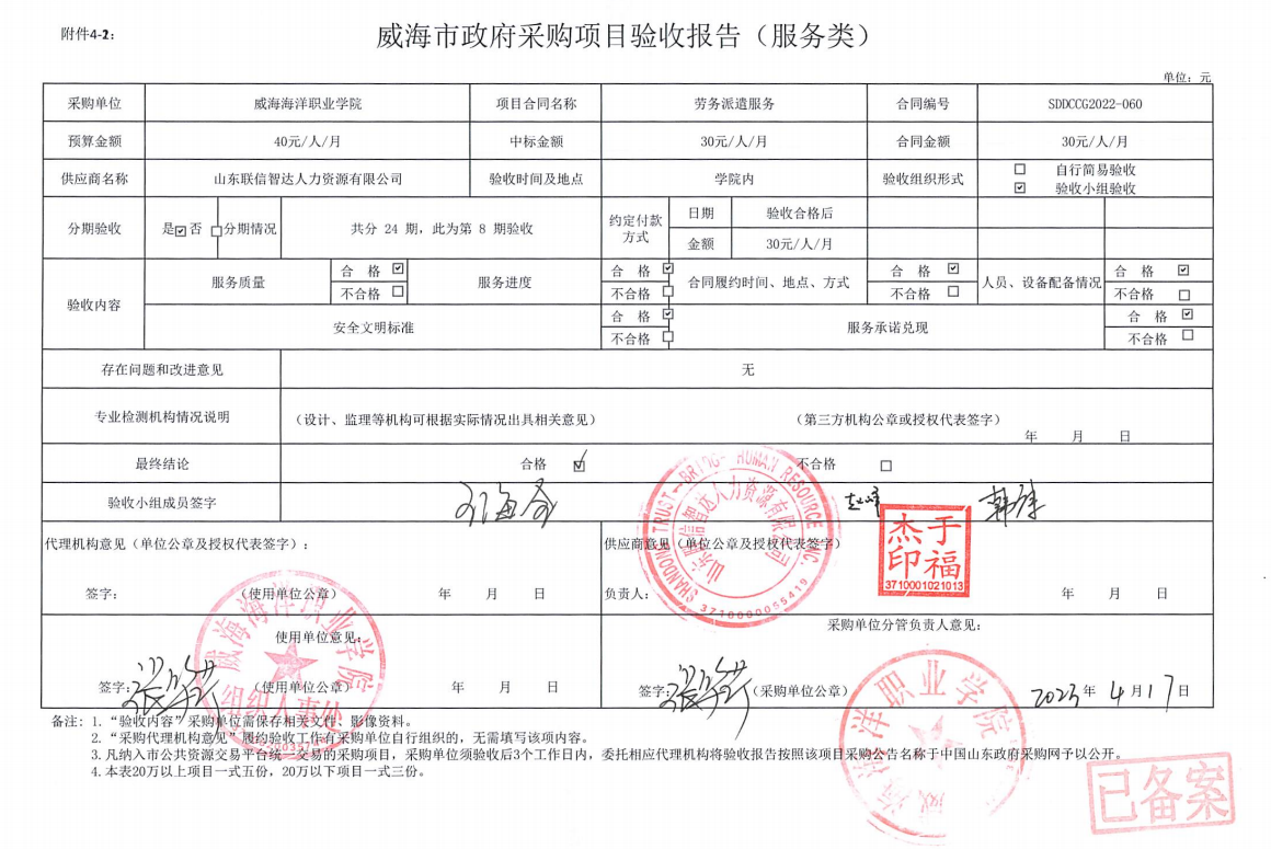 关于威海海洋职业学院劳务派遣服务项目第8期验收公示