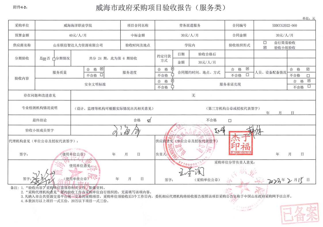 关于威海海洋职业学院劳务派遣服务项目第6期验收公示