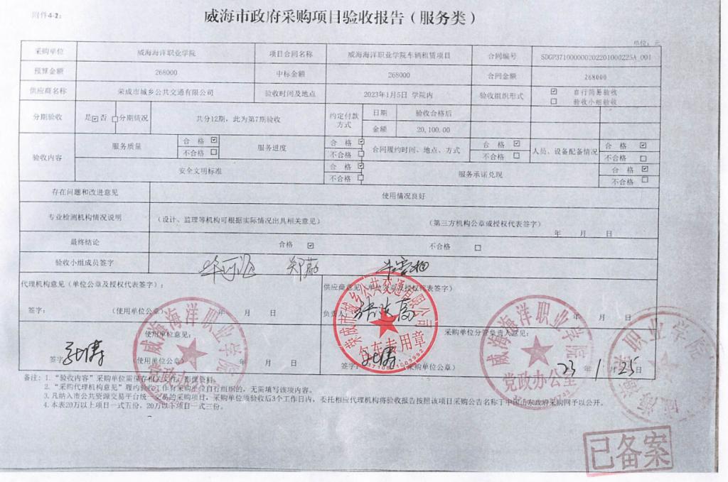 关于威海海洋职业学院车辆租赁服务项目(包一)第7期验收公示