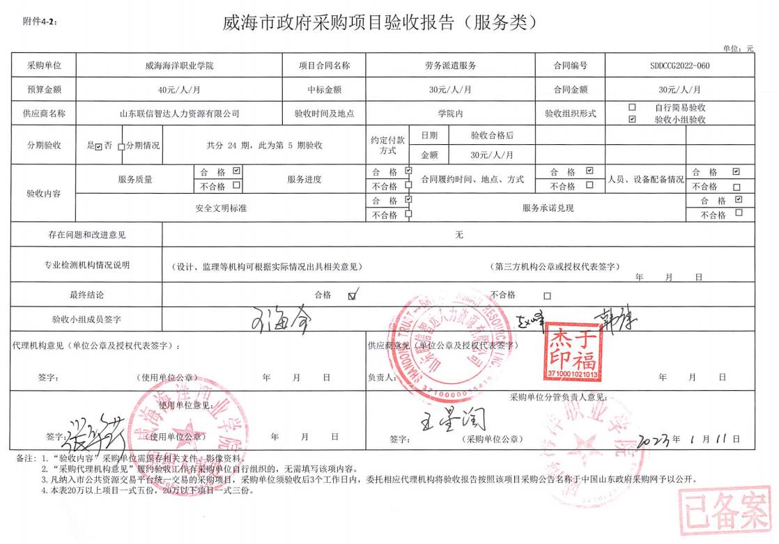关于威海海洋职业学院劳务派遣服务项目第5期验收公示