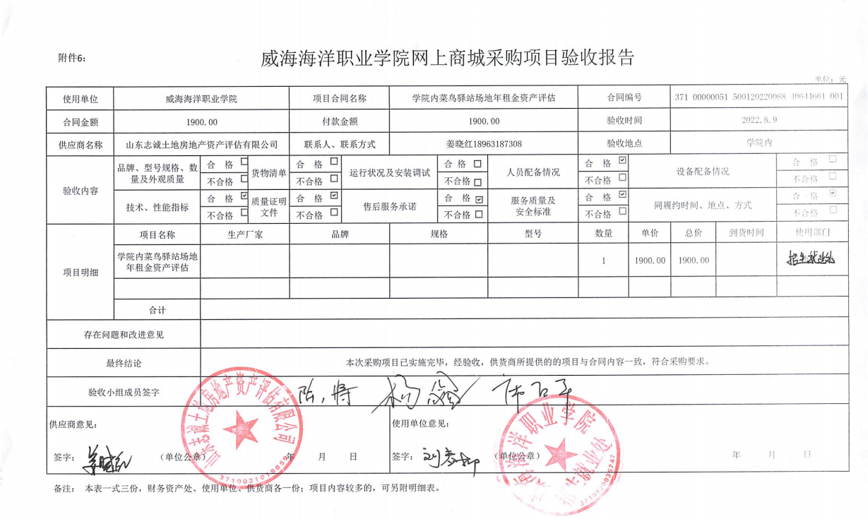 关于威海海洋职业学院学院内菜鸟驿站场地年租金资产