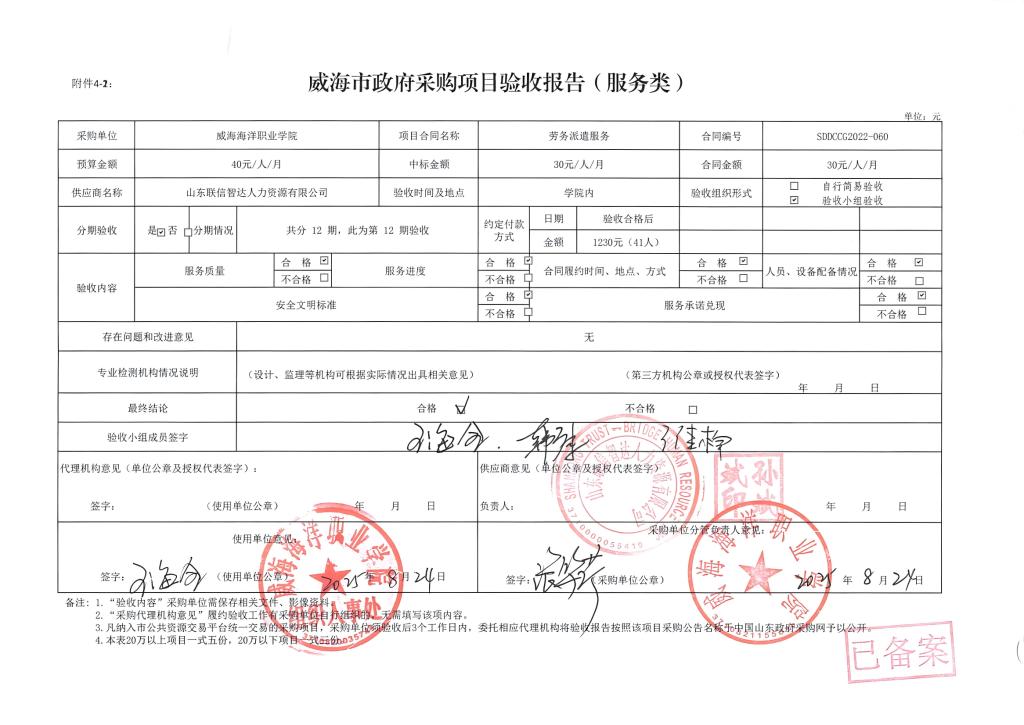 关于威海海洋职业学院劳务派遣服务续签项目第12期验收公示