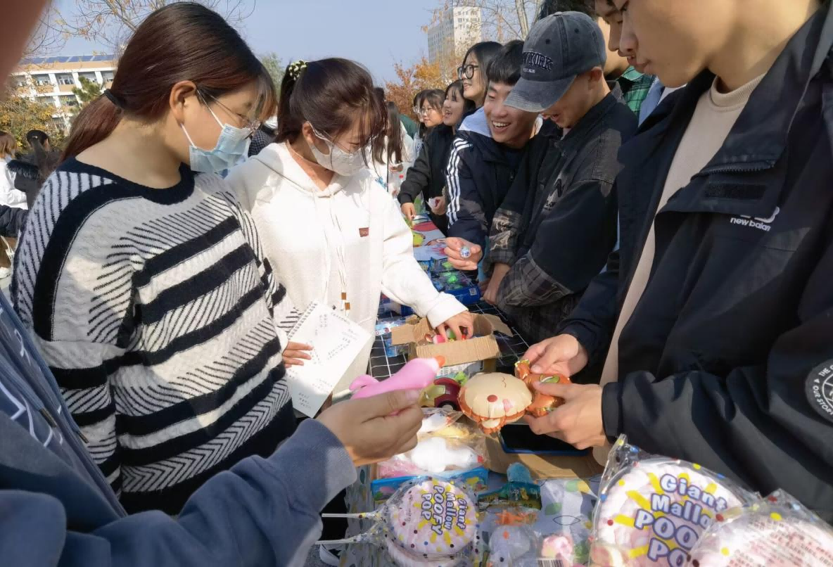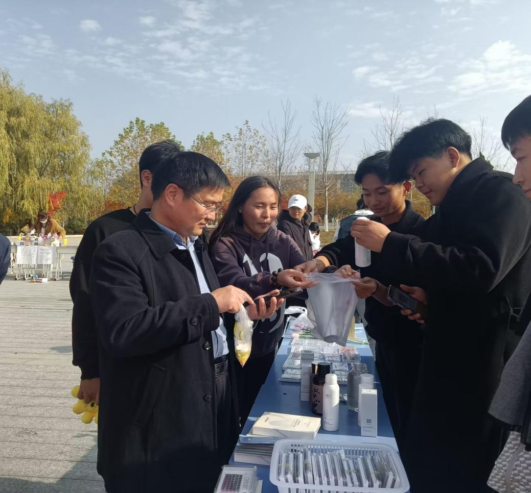 活动开始前30分钟,电商创业部部长及部员们来到一号餐厅前广场,开始进行场地布置。8点30分后陆续开始有同学前来咨询,部门成员都积极详细地回答他们的问题,并对商品用途做出全面系统的介绍。中午十一点,摊位迎来了“卖货高峰”,琳琅满目的商品,吸引了大批前来咨询、购买的老师与同学,活动人员更是激情高涨,身穿玩偶服主动拉客,并在抖音进行实时直播,线上线下结合同步进行宣传卖货。