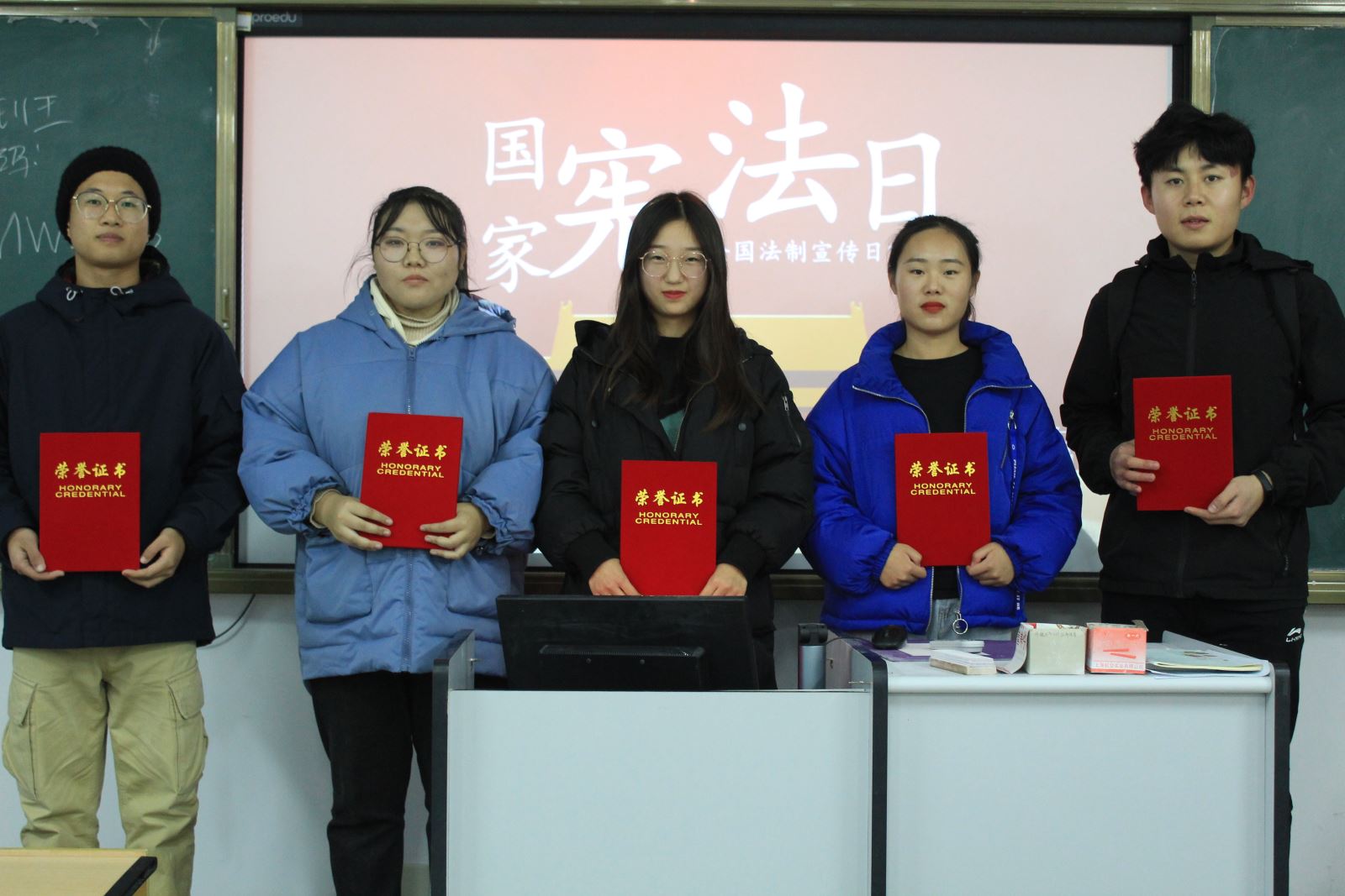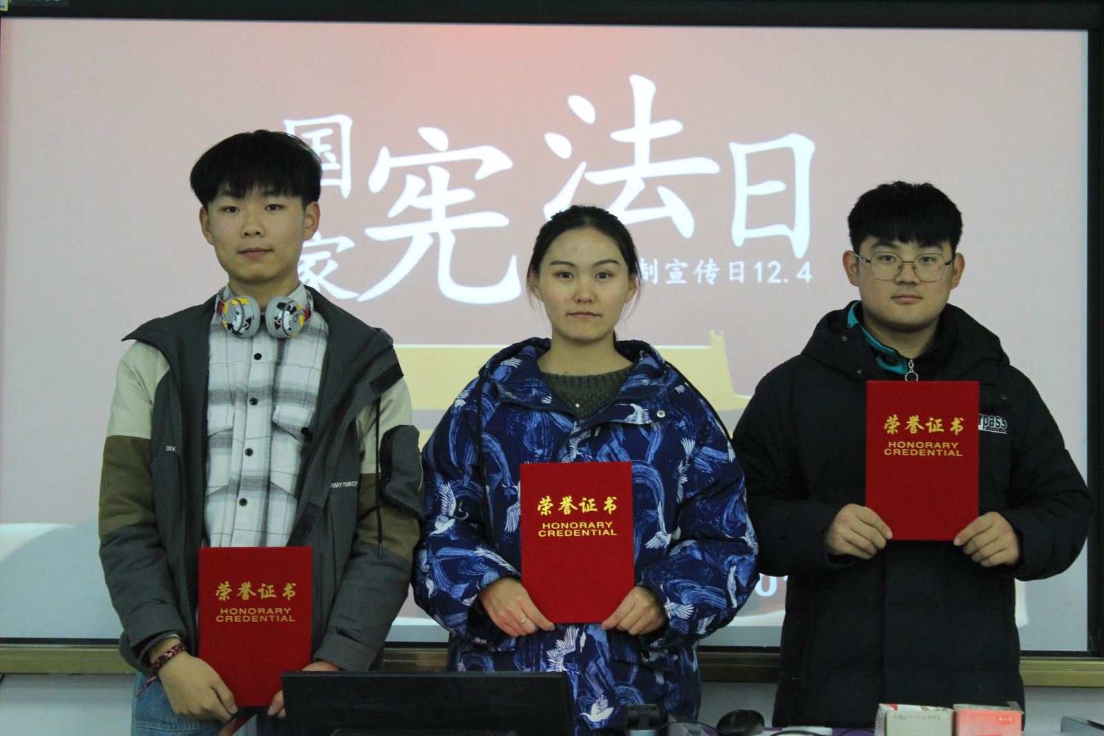 参赛选手提前15分钟到场并进行签字确认,考试开始前各考生自觉遵守考场纪律等待考试。考试一开始,各位考生有条不紊的进行答题,凭借着扎实的宪法知识基础和出色的临场发挥,上演了一场精彩的脑力较量和知识比拼,在各位考官的严厉监考下更加剧了紧张的气氛。随着时间的流逝,考生的紧张神色逐渐消失,渐渐全身投入,找到了自己的考试节奏。在紧张又激烈的考试结束后,所有人交卷离场。经过45分钟的作答,选出第一名为李诗腾,赵欣,师伟三名同学,第二名张奕飞,韩心雨等五名同学,第三名张宽,张学睿等六名同学。并对以上获奖同学进行颁奖。