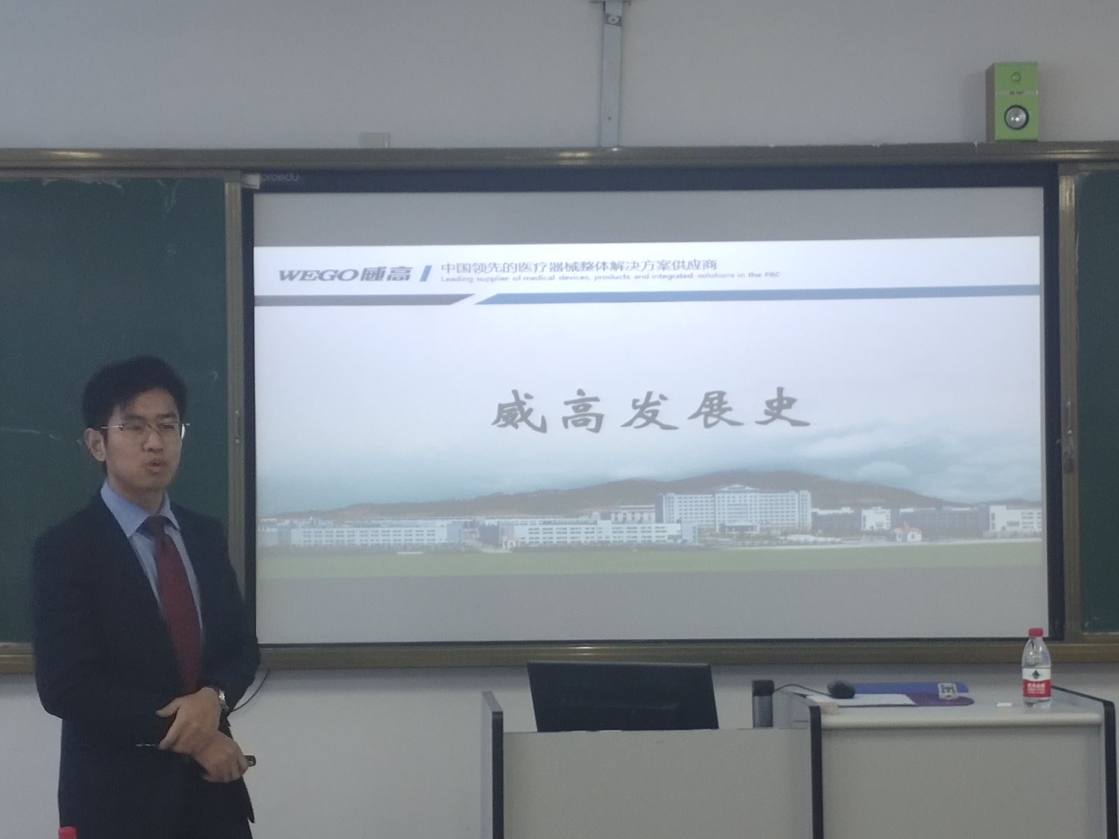 在开班仪式开始前,由李锡勇老师和崔洪萌老师挑选出此订单班的班委,接着由翟经理和马经理从创业开拓期的威高、调整巩固期的威高、创新发展期的威高及今天的威高四个板块分别详细讲述了威高的发展史,和一些就业的要求、工作条件、优厚的薪资待遇等,强烈的激起了同学们对威高集团的憧憬和向往,之后翟经理和马经理又为同学们讲述了为创建威高集团所付出的辛苦努力,并激励同学们要加倍努力,不断创新,在同学们阵阵掌声中结束了本次的开班仪式,最后和同学们合影留念。