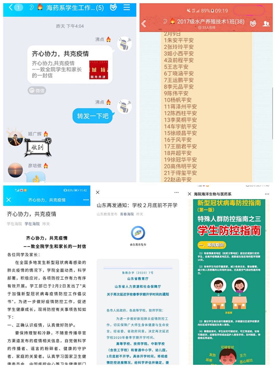 携手同心,传递温暖。疫情无情人有情,学生的平安健康牵动着老师的心。疫情发生以后,全体辅导员把防控的责任扛在肩上,把学生的安危放在心里,深入开展网络宣传、加强教育引导、提供精准服务,与广大学生携手同心,共同抗击疫情。发挥网络思政工作优势,扎实开展线上教育管理服务工作,辅导员“一对一”将疫情安全防控知识、心理教育知识和学校的关心慰问传递给学生;规范开展常态化信息监测,及时准确地掌握所有的学生疑似病情、体温自测等动态信息;协同心理健康咨询中心开通疫情防控心理支持服务,关注疫情期间学生心理健康状态,为全体学生提供及时的指导服务。