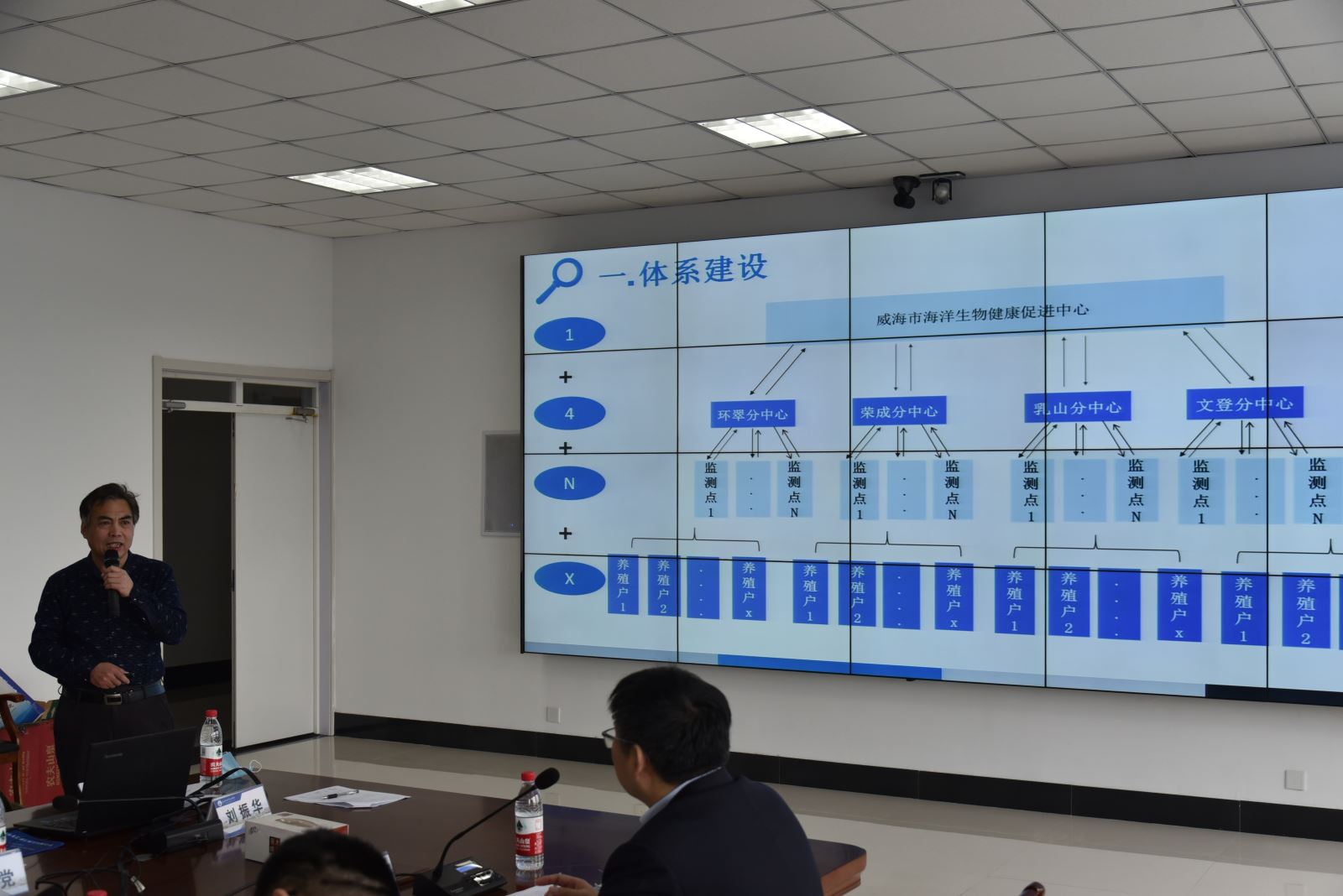 威海海洋职业学院党委委员刘振华从体系建构、组织人员、拟开展的服务项目、运行机制四方面介绍了威海市海洋生物健康促进中心的建设方案。随后,山东省渔业技术推广站邓丕松、陈涛、山东省海洋生物研究院病害与渔药中心主任叶海斌分别从病防体系的构建、队伍建设、健康养殖模式推广、精准服务等方面提出了宝贵的建议。