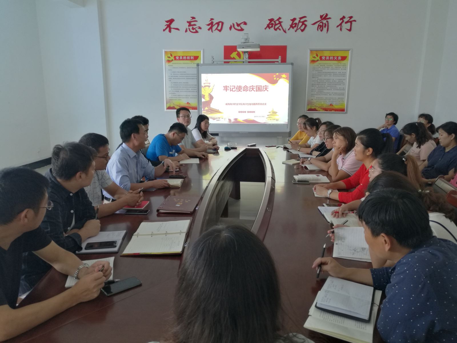 为庆祝中华人民共和国成立70周年,展示新中国成立70年来的丰硕发展成果,增强凝聚力,激发全系教师砥砺奋进、跨越发展的热情。结合当前正在开展的“不忘初心、牢记使命”主题教育,海洋生物与医药系于2019年9月30日开展了“牢记使命庆国庆”活动,为祖国华诞献上了一份盛礼。