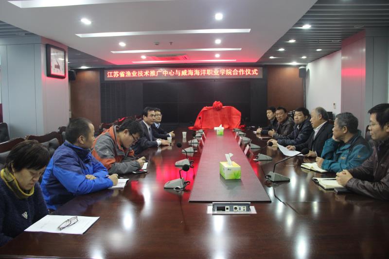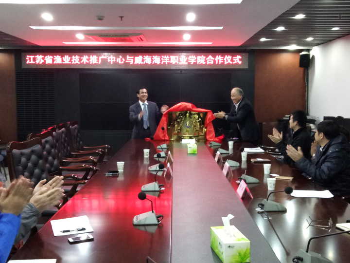 12月6日下午,我院与江苏省渔业技术推广中心合作签约及揭牌仪式在江苏省渔业技术推广中心举行,出席仪式的有江苏省渔业技术推广中心主任、党委书记张朝晖研究员,中心党委副书记张永江研究员,中心副主任陈焕根研究员,中心副主任陈辉研究员,威海海洋职业学院海洋生物与医药系主任刘振华教授。陈辉主任和刘振华主任代表双方在合作协议上签字并进行了揭牌仪式。会上双方就资源共享,创新科研合作,师资培养,学生实训互惠共赢等方面达成共识。