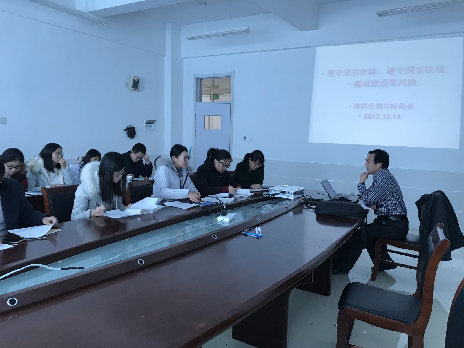 为进一步加强党员党性党风党纪教育,2011年12月14日下午,海洋生物与医药系党总支在会议室召开本学期党风廉政专题工作会议。海洋生物与医药系党总支刘振华教授参加并主持了会议,海洋生物与医药系全体党员教师参加了会议。