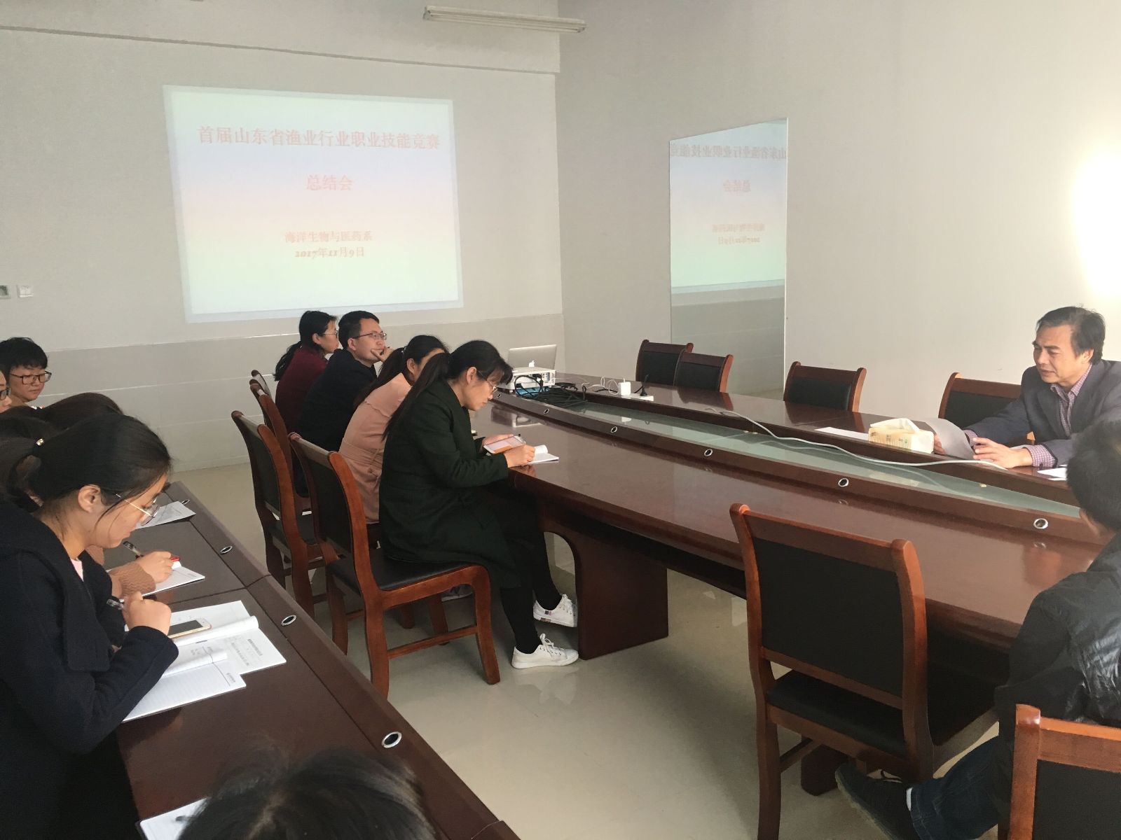 威海海洋职业学院在承办本次比赛中获得特别贡献奖,我系于11月9日召开了首届全省渔业行业职业技能竞赛总结交流会,会上,全体教师根据本次竞赛过程提出了改进的意见和建议。