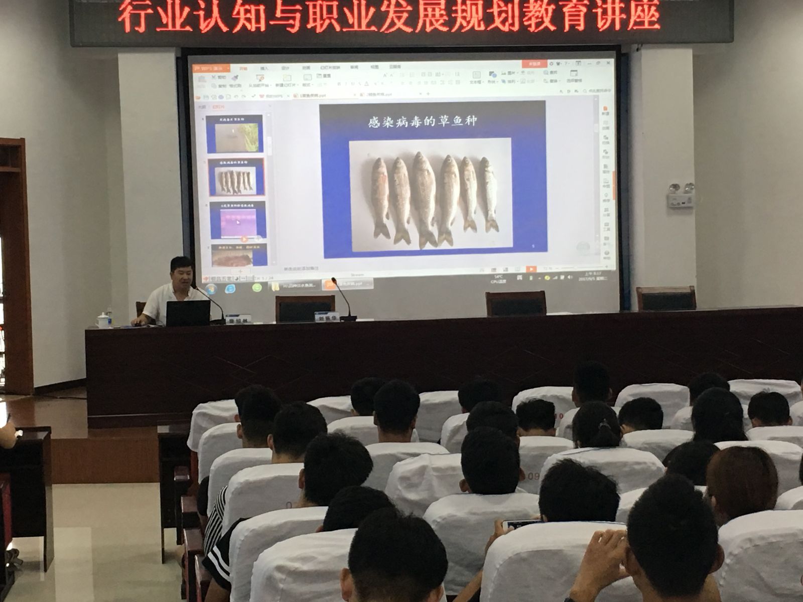 唐绍林经理从事水产行业28年,拥有丰富的生产实践经验。在此次讲座中,唐绍林经理从草鱼出血病、鲤鱼疾病的发病症状、流行情况、影响病毒性出血发病的因素以及如何诊断并采取有效的措施进行预防等方面为学生进行了详细的讲解。学生们认真听讲、仔细做笔记,不懂之处及时提问。