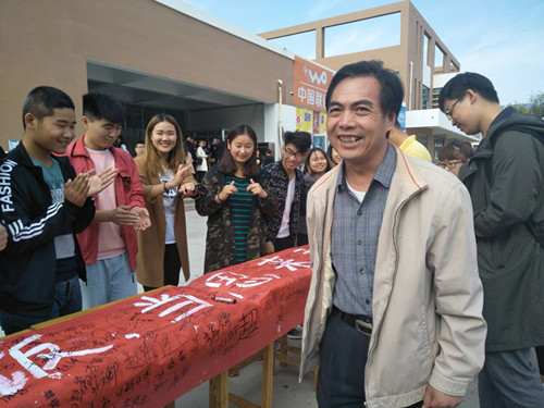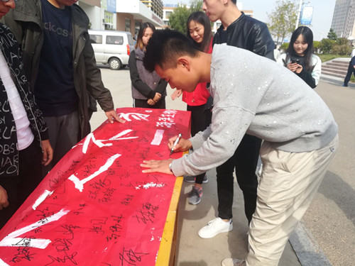 在活动开始时,我系刘振华教授带领全系教职工来到第一食堂门口,率先垂范留下了自己的名字。下课后,全校同学们在学生会的引导下纷纷签下了自己的名字,仅仅20分钟6米长的条幅被众师生的名字所覆盖。通过这一个简简单单的签字活动可以看出的众人对爱粮节粮政策的重视,对爱粮节粮的决心。活动结束后同学们一起拿起条幅合影留念。