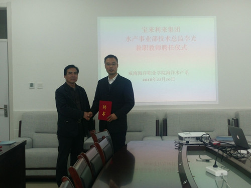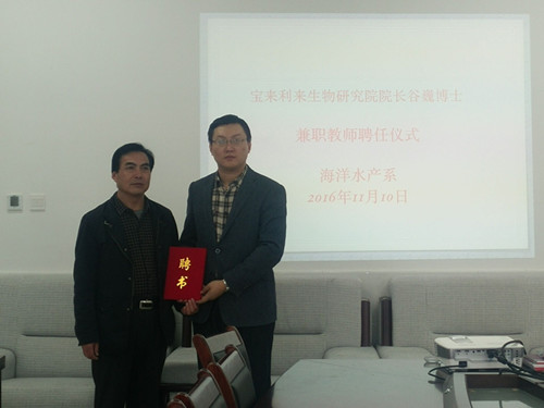 最后双方进行了座谈,深入探讨了关于校企合作的具体事宜。谷巍博士对于我院“与行业、企业发展需求相融合”的人才培养模式非常认可,希望学院多为公司输送的水产养殖专业人才,对于学院的支持表示感谢。刘振华教授对宝来利公司领导为师生做的精彩讲座表示感谢,同时邀请宝来利来水产技术团队的专家们,定期到学校为海洋水产系学生授课,并聘任谷巍博士为我院兼职教授。