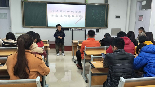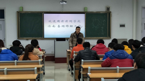 学院为拓宽毕业生的就业渠道,于2016年11月26日上午在体育馆召开2014届毕业生校园招聘会,共有150家之多的企业到我校进行现场招聘,与我系直接相关的公司有50余家。招聘会结束后,海洋水产系系邀请企业宣讲、面试相关应聘者,学生积极与招聘人员交流,主动了解用人单位的情况,大部分同学与企业签订了顶岗实习协议书。为给即将顶岗实习的海洋水产系学子们留下最美好的回忆,给他们的大学生活划上圆满的句号,送上最诚挚的祝福。借此临别之际,我系于2016年11月28日晚6点,在B2-401特别举办了周升升同学赴济南喜顺锦鲤工作的欢送会。