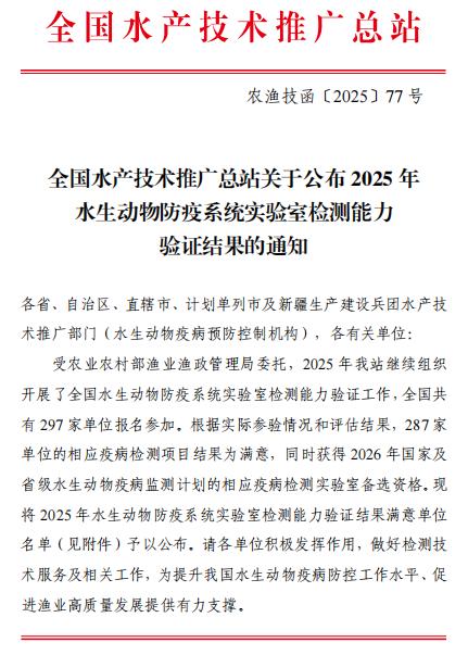 近日,全国水产技术推广总站正式公布2025年全国水生动物防疫系统实验室检测能力验证结果。威海市海洋生物健康促进中心(以下简称“中心”)参加的白斑综合征(WSSV)、牡蛎疱疹病毒病(OsHV)、病毒性神经坏死病(VNNV)等8项重大水生动物疫病检测项目,验证结果均为“满意”。凭借此次优异成绩,中心成功获得参与2026年国家及省级水生动物疫病监测计划相应疫病检测工作的实验室备选资格。