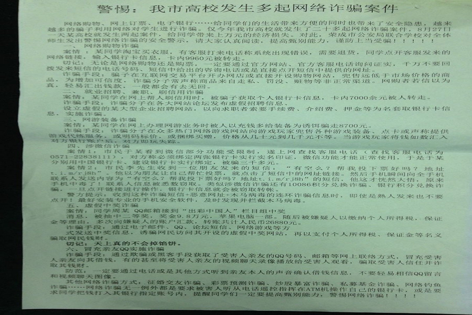 活动由系团委组织策划,采用案例警示与宣传引导相结合的方式。首先通过播放真实的大学诈骗案件纪录片和宣讲发生在我们身边的诈骗案件发生过程,引起同学们的重视,使同学们对诈骗有初步的了解;其次是系统地介绍高校常见诈骗案惯用手段,包括:伪装身份,流窜作案、网上行骗、电话行骗、手机短信行骗等;针对大学生经常使用电脑和手机的现状,尤其强调了预防网上行骗和电话行骗的方法和措施,告知同学们不要轻易尝试自己不熟悉的银行业务,不要轻信陌生人的电话和手机短信,不要轻易泄露自己的银行卡账号密码和身份证号码等等,牢记“三不一要”,即:不轻信、不泄露、不转账、遭遇诈骗要及时报案;最后,为了让同学们对校园诈骗常备不懈,还将宣传工作落实到各班、各宿舍,印发防诈骗宣传材料分发给各宿舍舍长,形成辅导员老师带头,班委、舍长配合的三级教育督促机制,力争将校园诈骗的损失降到最低。