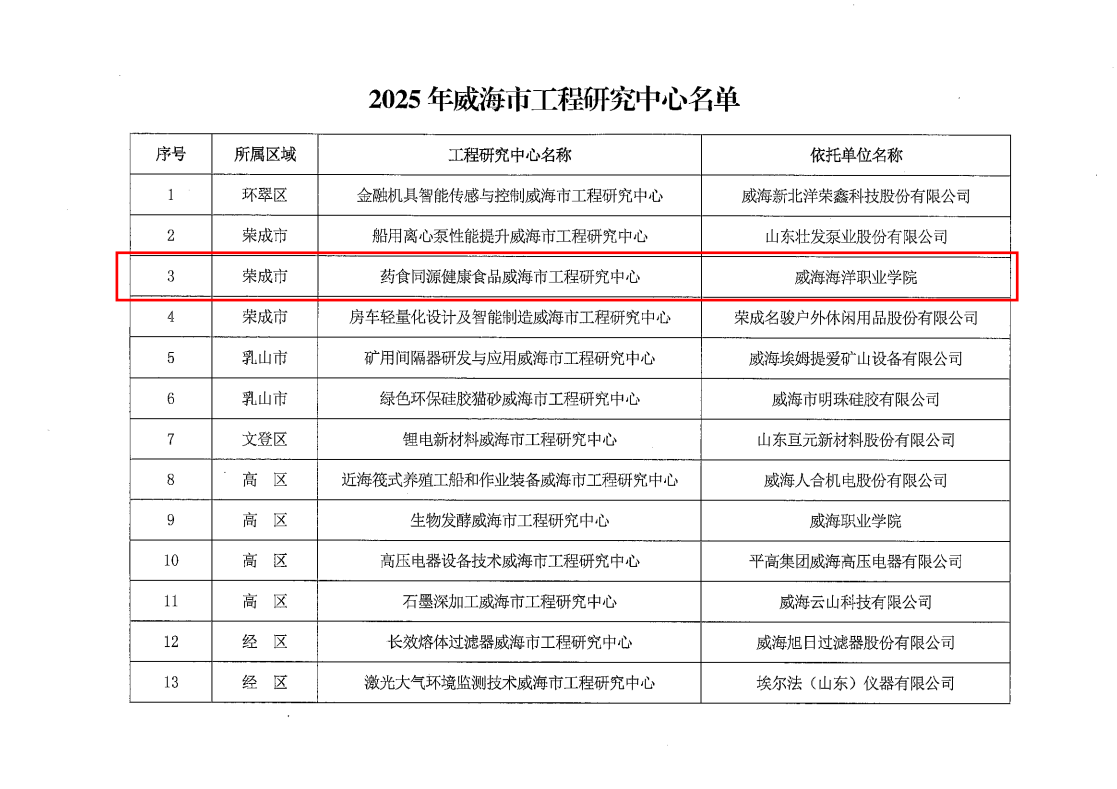 近日,威海市发改委公布了2025年威海市工程研究中心认定名单,学院食品与药品系申报的“药食同源健康食品威海市工程研究中心”获批。