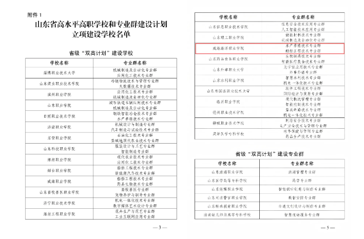 日前,山东省高水平高职学校和专业群建设计划立项建设学校名单公布,威海海洋职业学院以鲜明的办学特色、扎实的办学基础和显著的育人成效,成功入选省级“双高计划”建设学校。