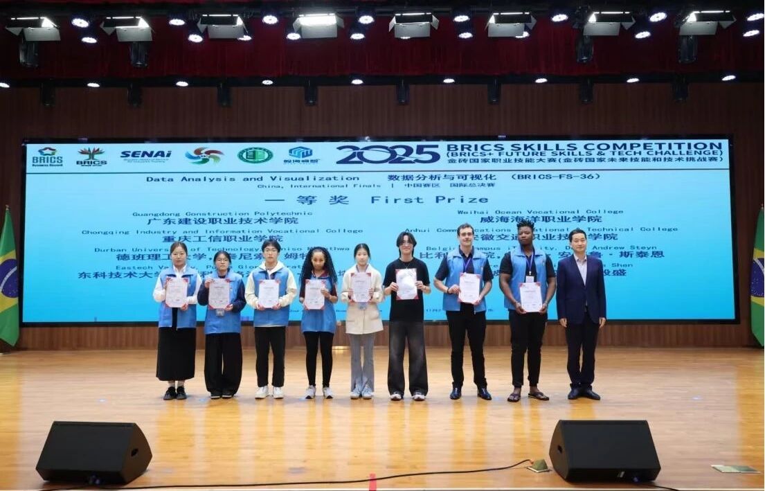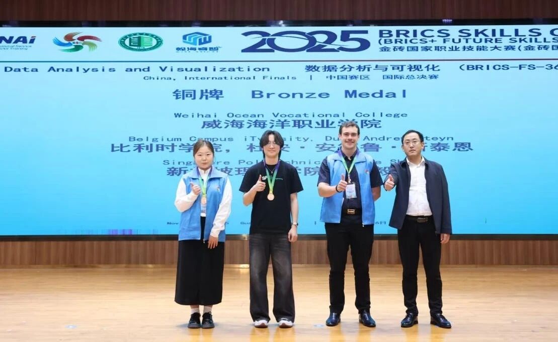 2025金砖国家职业技能大赛数据分析与可视化赛项中国赛区国际总决赛,近日在广东建设职业技术学院举行。威海海洋职业学院电子商务系邓一诺同学,以中国排名第三的总成绩荣获国际铜牌、全国一等奖。同时,指导教师左晓芬荣获“优秀指导专家”称号。