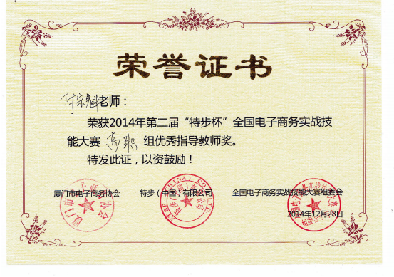 信息工程系的付宗魁老师,荣获2014年第二届“特步杯”全国电子商务实战技能大赛高职组优秀指导教师奖。