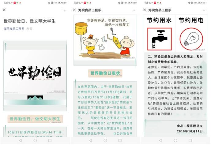 10月29日,该系利用微信公众号等新媒体发布《世界勤俭日,做文明大学生》知识,向全院师生发出节约水电、节约纸张、少用“一次性”用品、厉行节俭资源共享的倡议,引导师生增强节约资源的自觉性、主动性。发起了以为“勤记心怀,俭以养德,创建文明校园”为主题签名活动,学子们积极响应,纷纷在宣传横幅上签字,誓要养成勤俭节约的好习惯。