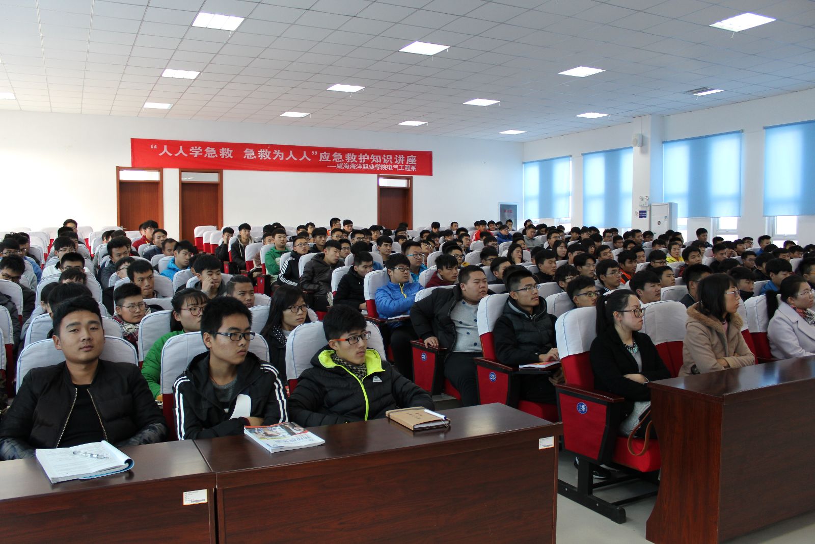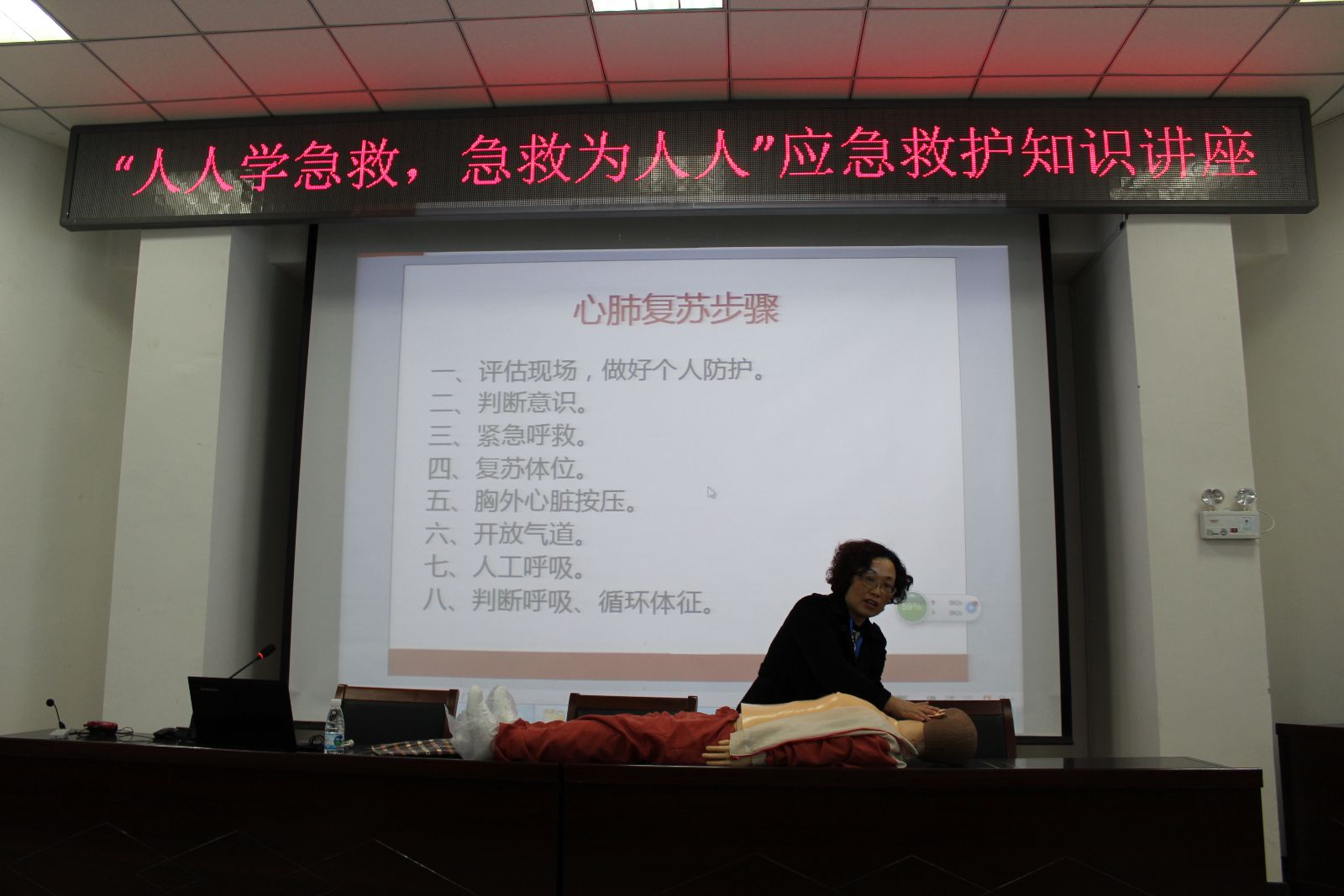 四、组织“人人学急救,急救为人人”应急救护知识讲座。为提高师生处理突发事件的能力,普及自救与互救常识,降低危险发生率。我系邀请了荣成市红十字会业务部主任来做了应急救护知识讲座。她向师生们详细讲解了具体的紧急救护流程,为了是同学们可以更好地领悟,彭主任用人体模型进行了模拟人心肺复苏操作,并且请在场师生上台演示,实时地纠正他们在操作的过程中的错误及不规范之处。