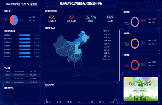 智慧迎新系统不仅简化了现场报到流程,也便于学校提前掌握学生来校行程及相关信息,及时与学生取得联系和统筹安排接站,同时为学校保卫部门校园弹性管理、后勤部门交通车接驳、餐饮供应,有效支持管理决策,发挥数据价值。报到当日,智慧迎新系统助力学校分学院、分地域、分楼栋实时掌握报到进度,及时了解新生报到动态,为合理分配调整迎新工作配比投入起到了关键性的数据支撑作用。