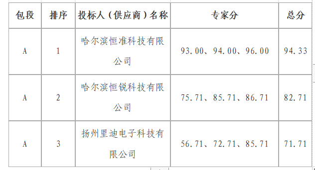 本项目(包段)按照综合评分法评审,排序第一的报价供应商为本项目的成交供应商,其余报价供应商均为未成交供应商。各报价供应商未成交的原因为:哈尔滨恒锐科技有限公司评审得分较低(产品选用评审点、系统设计方案评审点、项目实施方案评审点、售后服务方案评审点等评审因素不占优势)扬州里迪电子科技有限公司评审得分较低(产品选用评审点、系统设计方案评审点、项目实施方案评审点、售后服务方案评审点等评审因素不占优势)