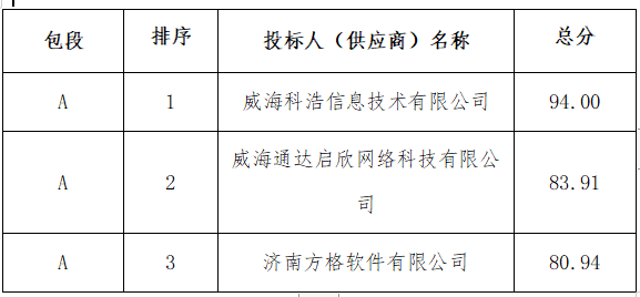 本项目(包段)按照综合评分法评审,排序第一的报价供应商为本项目的成交供应商,其余报价供应商均为未成交供应商。各报价供应商未成交的原因为:济南方格软件有限公司、威海通达启欣网络科技有限公司评审得分较低。