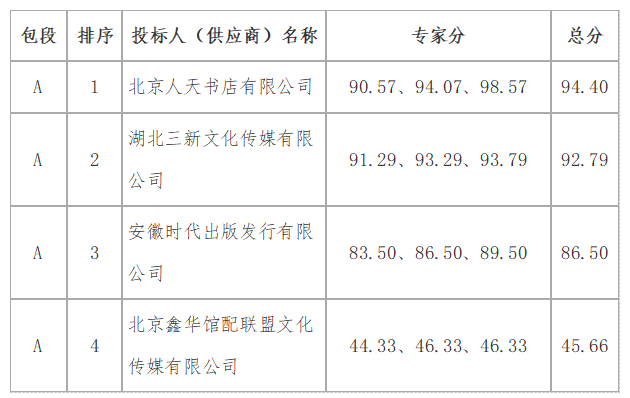 本项目(包段)按照综合评分法评审,排序第一、第二的报价供应商为本项目的成交供应商,其余报价供应商均为未成交供应商。各报价供应商未成交的原因为:安徽时代出版发行有限公司、北京鑫华馆配联盟文化传媒有限公司评审得分较低(报价供应商的整体实力及服务方案评审点、图书质量与图书进货渠道保障评审点、服务支持及优惠条件评审点、售后服务及培训评审点、业绩评审点、质保期评审点等评审因素不占优势)