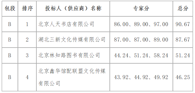 本项目(包段)按照综合评分法评审,排序第一的报价供应商为本项目的成交供应商,其余报价供应商均为未成交供应商。各报价供应商未成交的原因为:湖北三新文化传媒有限公司、北京林知路图书有限公司、北京鑫华馆配联盟文化传媒有限公司评审得分较低(服务方案评审点、对订单调整要求的反应能力评审点、对未能采购报刊订单的处理评审点、退报刊的处理评审点、服务承诺评审点、特色服务、增值服务评审点、业绩评审点等评审因素不占优势)