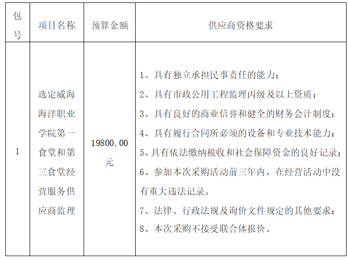 一、项目名称:选定威海海洋职业学院第一食堂和第三食堂经营服务供应商监理