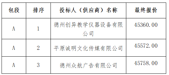 本项目(包段)按照最低评标价法评审,排序第一的报价供应商为本项目的成交供应商,其余报价供应商均为未成交供应商。各报价供应商未成交的原因为:德州众航广告有限公司、平原诚明文化传媒有限公司报价较高。