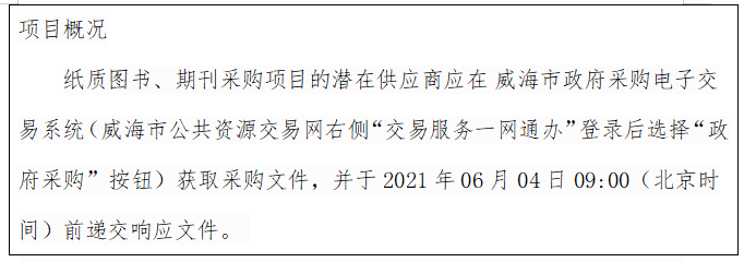地点:通过威海市政府采购电子交易系统网上递交。已在威海市政府采购电子交易系统获取文件的供应商在规定时间内递交电子投标(响应)文件。