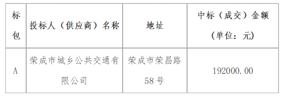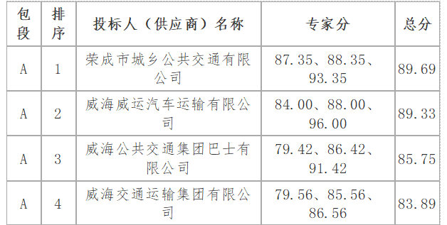 本项目(包段)按照综合评分法评审,排序第一的报价供应商为本项目的成交供应商,其余报价供应商均为未成交供应商。各报价供应商未成交的原因为:威海威运汽车运输有限公司评审得分较低(报价单位拟提供的车辆情况评审点、安全生产管理制度情况评审点、服务方案评审点、人员配备评审点、企业实力评审点不占优势); 威海公共交通集团巴士有限公司评审得分较低(价格分评审点、报价单位拟提供的车辆情况评审点、安全生产管理制度情况评审点、服务方案评审点不占优势); 威海交通运输集团有限公司评审得分较低(价格分评审点、报价单位拟提供的车辆情况评审点、安全生产管理制度情况评审点、服务方案评审点、人员配备评审点不占优势)。